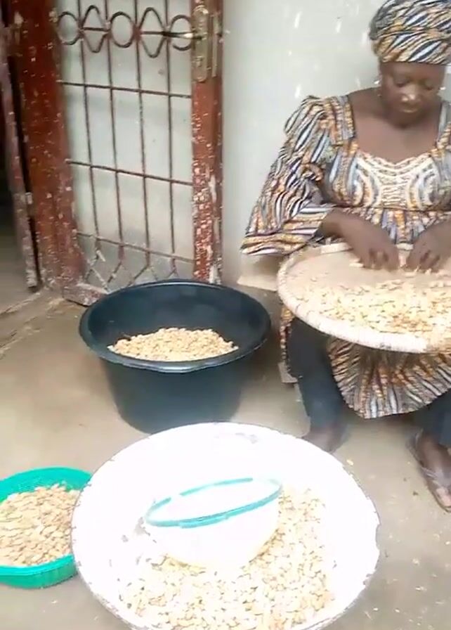 A woman sits outside of a building and shells peanuts. The woman is wearing a patterned, tan and black dress and a matching head wrap. She sits on a small stool and has a round, woven tray on her lap, filled with peanuts in their shells. Her hands move, breaking open the shells to reveal the peanuts inside. To her left is a large, white enamel bowl, mostly full of peanuts, with a small colander placed on top. There's also a smaller, green bowl with peanuts in the shells. Behind the white bowl is a black bucket containing peanuts in the shells. Behind the woman is a building with a barred door on the left, and a blue window on the right. The ground is light gray concrete.