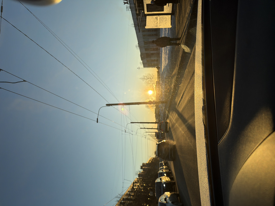 The image captures a winter street scene in Saint Petersburg, Russia, likely along a major avenue such as **Prospekt Veteranov** or a similar wide thoroughfare in the city's southwestern districts. The viewpoint is from inside a vehicle, evidenced by the frosted dashboard in the foreground and a reflection in the upper right. The scene is dominated by a clear, bright blue sky and a low-angle sun positioned directly ahead, causing significant lens flare and casting long, sharp shadows across the road surface. The lighting creates a strong golden hue on the street, the vehicle's interior, and structures on the right. The main subject is a multi-lane urban road, appearing to have at least two lanes in the direction of travel, with active traffic. The asphalt surface is dark, with visible patches of snow and ice, indicating freezing temperatures. Overhead, a dense network of electrical wires for trams stretches along the street, supported by numerous utility poles. On the left side of the road, a continuous line of multi-story residential buildings, consistent with Soviet-era architecture, extends into the distance. These structures appear to be made of brick or concrete panels. A sparse line of bare trees stands along the sidewalk on this side. On the right side of the road, a sidewalk leads to a bus or tram stop. The stop includes a glass-paneled shelter. Adjacent to the shelter is a low, rectangular commercial building with a dark facade, featuring partially visible white Cyrillic letters "ХА" on its upper section, possibly part of "ХАЗАР" (Khazar), a common kiosk chain. Beyond this commercial building, the ground is covered in snow, and a few small, bare trees are visible, suggesting a more open or less densely developed area. Two individuals are present on the right near the bus stop. One person, silhouetted against the bright sun, stands on the curb facing the street, clad in dark, bulky winter clothing. Another person is partially obscured behind the bus stop shelter. A line of vehicles, including sedans and SUVs, is seen moving or queuing in the same direction as the camera. Their forms are partially silhouetted or front-lit by the low sun, creating a hazy effect. Faint traces of exhaust or kicked-up snow are visible behind some vehicles, affirming the cold weather. The overall environment is cold and bright, depicting a typical urban winter day with active public transport and vehicular traffic.