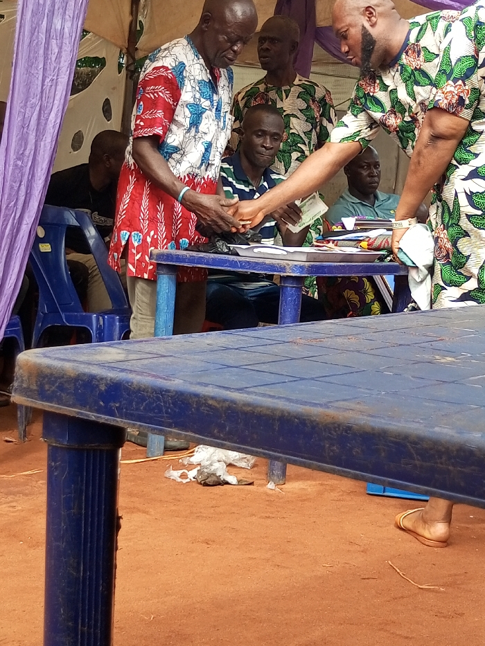 This image depicts a semi-outdoor gathering in Oko Town, Nigeria, under what appears to be a temporary fabric shelter or tent, distinguished by a purple fabric curtain on the left