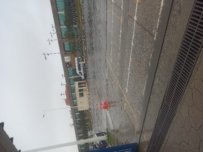 The image captures an exterior view of a Marjane supermarket in Gueznaïa, Morocco, on an overcast day with evidence of recent or ongoing rain. The foreground consists of a wet asphalt parking lot featuring white and yellow painted lines, with a dark metal drainage grate running horizontally across the bottom, bordering a patterned concrete path. Two orange and white traffic cones are positioned in the mid-left of the parking lot. A small, light-colored building, possibly a security booth, is situated in the mid-ground, with a white van parked to its right. A motorcycle is partially visible on the far-left edge. The background is dominated by the multi-story Marjane supermarket building, identifiable by its brown horizontal paneling, green-tinted windows, and visible "M" and "Marjane" logos on its facade. Multiple multi-headed streetlights are distributed across the scene, and a satellite dish is visible on the roofline of the background building. No individuals are present in the frame.