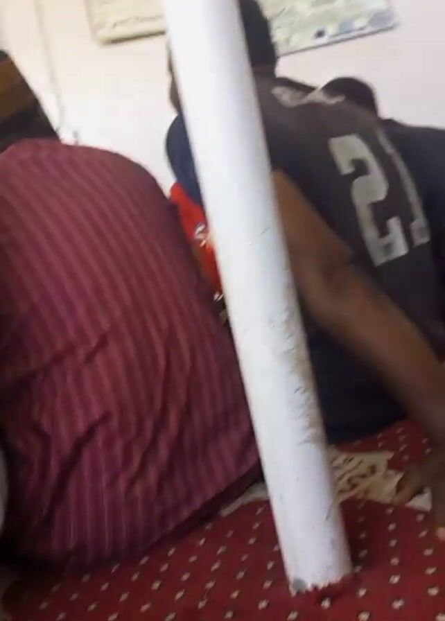 Several people are sitting on a patterned red rug indoors, seemingly in a place of worship. One person is wearing a maroon striped shirt and a brown and gold cap. Another person is wearing a white robe and black shoes. A third person is wearing a black shirt with the number 21 on it. A white pole is also present in the scene. There is a white board hanging on the wall. The rug has a repeating pattern of red, yellow, and blue. Feet are visible in the foreground.