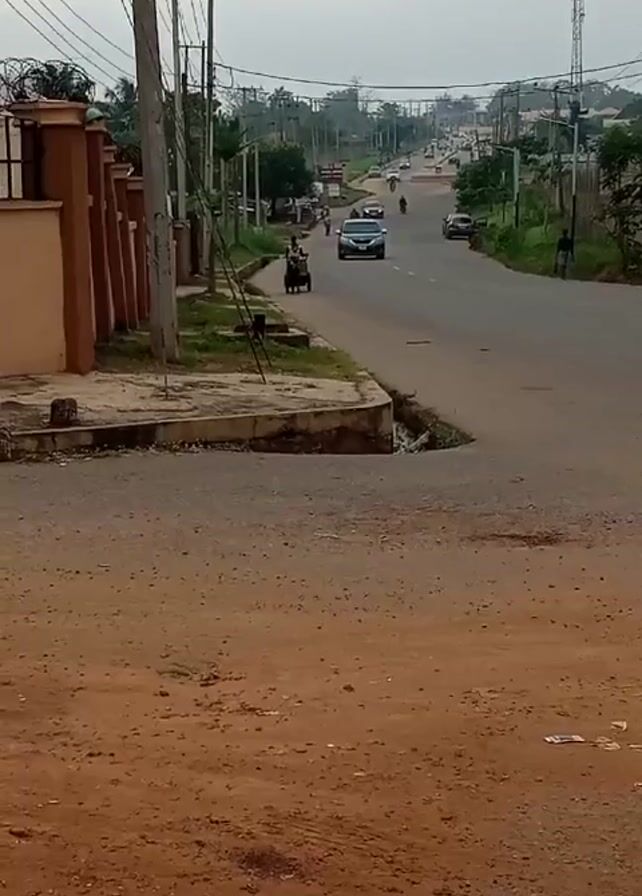 street scene in what appears to be a suburban or rural area. The camera is positioned at an intersection, looking down a slight slope onto a paved road with traffic. Several cars and at least one motorcycle are visible on the road. The road is lined with vegetation and utility poles carrying power lines. On the left side of the frame, there is a low, tan-colored building with a black iron fence topped with barbed wire. A street sign reading "ALFRED KEHINDE OLALUSI STREET" is visible on the corner near the building. The ground in the immediate foreground is dirt. The sky is overcast, suggesting a cloudy day.
