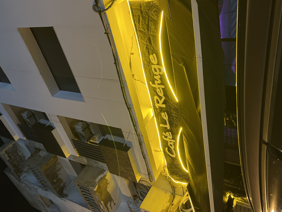 The image displays the illuminated facade of "Café Le Refuge" at night in Casablanca, Morocco