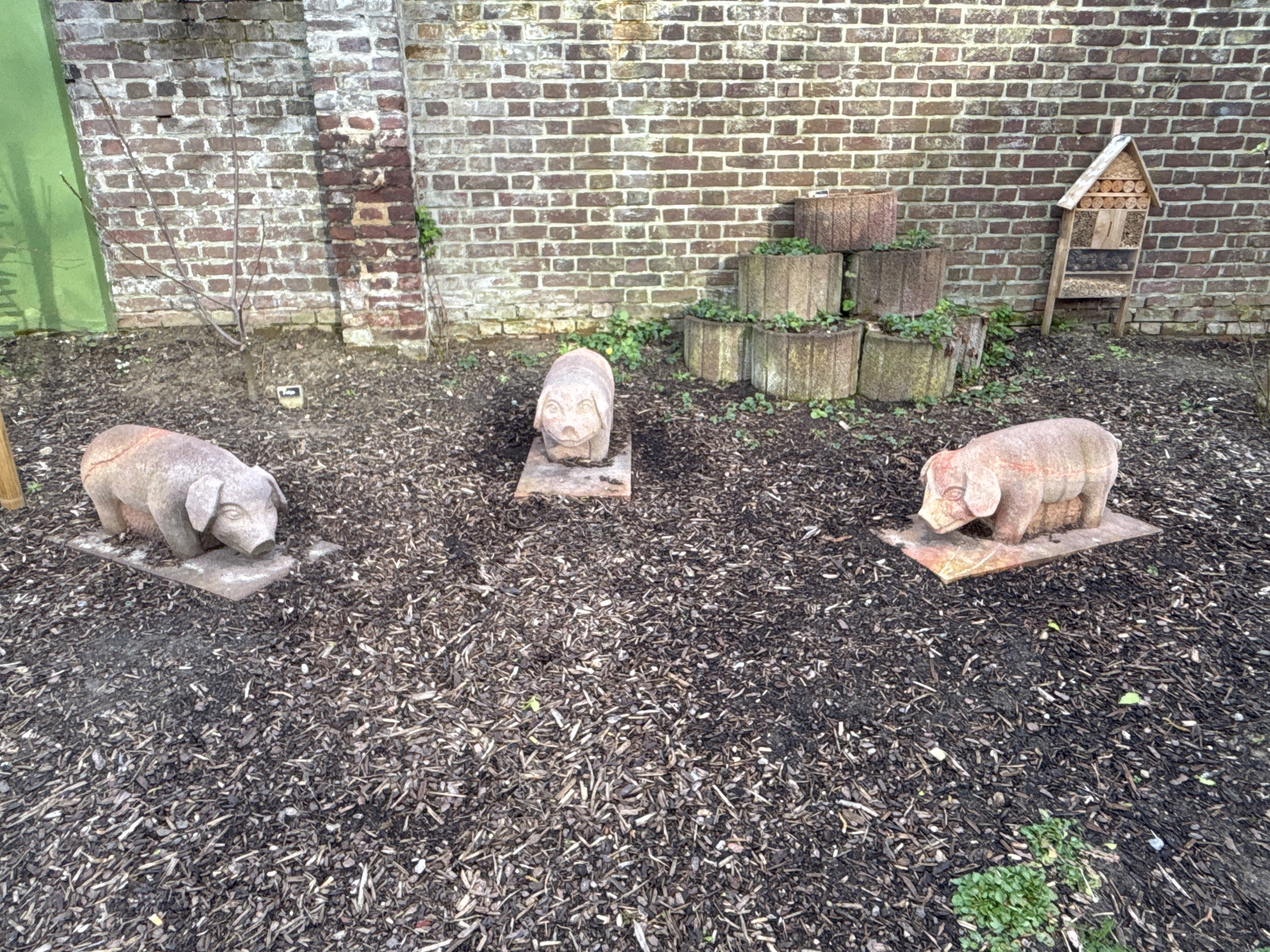 The scene depicts an outdoor garden or courtyard located in Lobberich, Germany. The ground is covered with dark brown wood mulch, from which sparse green vegetation emerges in various spots. In the foreground, three light-colored, weathered pig statues are positioned on individual rectangular bases. From left to right, the first pig statue faces generally forward and slightly right, exhibiting a reddish hue in places. The central pig statue, lighter in color, faces forward. The third pig statue on the right, also weathered, faces forward and slightly left. A weathered brick wall serves as the background. To the left, a small, bare-branched deciduous plant stands against the wall, with a partial green panel visible on the far left. Towards the center-right against the brick wall, six concrete planters are stacked in a pyramid-like arrangement (three at the base, two above, one on top), containing some green foliage. To the far right, a wooden insect hotel, featuring various compartments, leans against the brick wall.