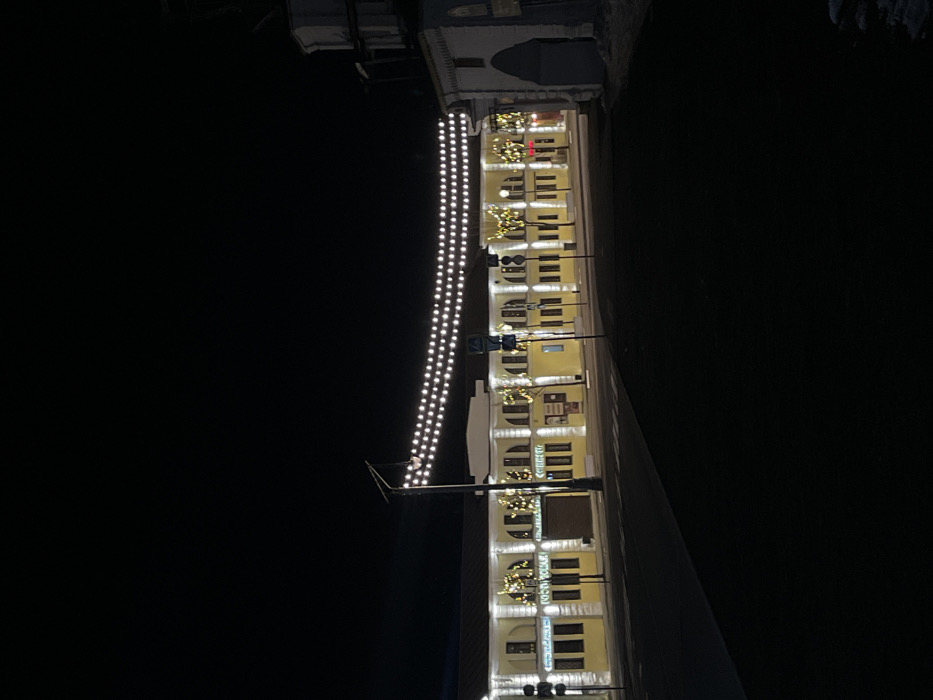 The image depicts a nighttime street scene in Ново-Никольское, Russia. A long, two-story building with a yellow facade, white architectural details, and multiple arched windows spans the middle ground. Several ground-floor establishments are visible, featuring illuminated signs, one of which reads "ГОСТИНИЦА" (Hotel) and another "СОВЕТЫ" (Advice/Tips). Trees positioned along the building's front are adorned with white string lights. Three parallel lines of small white string lights are suspended overhead across the street, supported by dark poles. Street infrastructure includes a streetlight, various road signs (including a pedestrian crossing sign and a speed limit sign), and a partial view of a traffic light on the left. The foreground consists of a dark, paved roadway. To the far right, a light-colored structure, possibly made of stone, with a distinct rounded archway is partially visible, with snow present on the ground at its base. No individuals are present in the scene.
