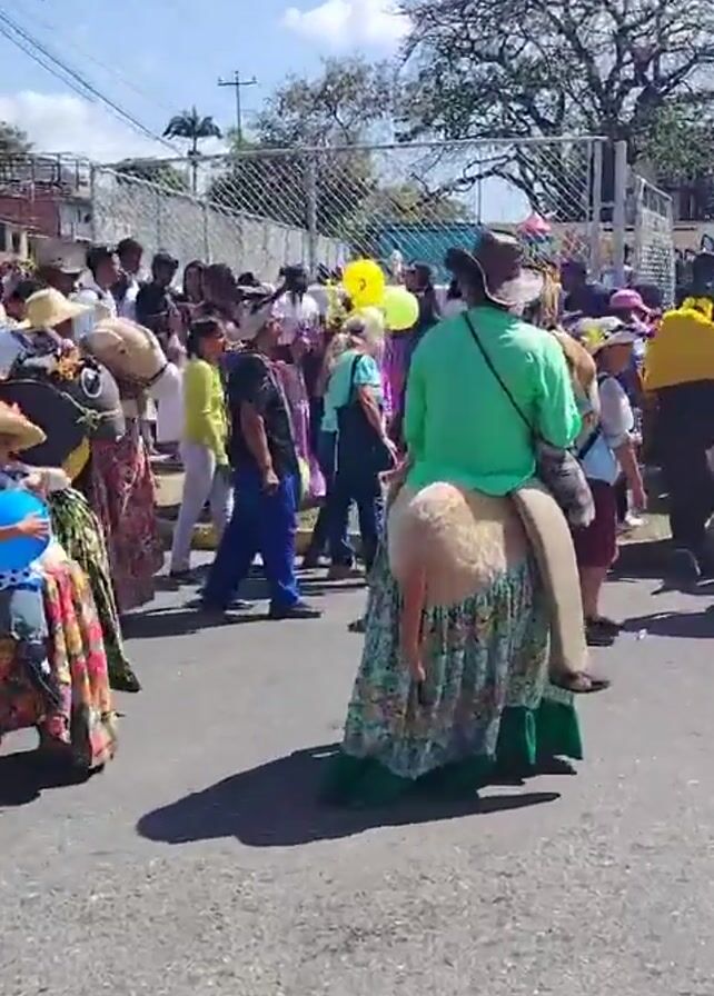 crowd of people on a paved street, many of whom are dressed in colorful traditional costumes that mimic the appearance of riding a horse or donkey