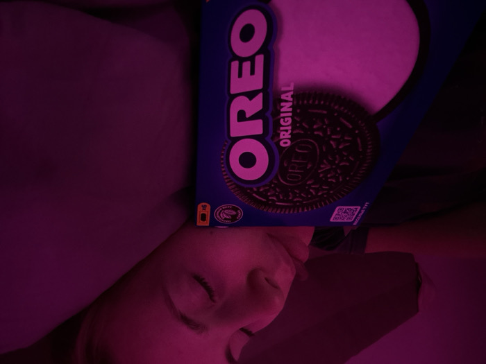 The image, captured in Novoe Devyatkino, Russia, displays an indoor scene under strong magenta illumination. An individual with closed eyes is observed sleeping or resting on their right side, head supported by a light-colored pillow. Adjacent to the person, a blue box of "OREO Original" cookies rests on its side. The box prominently features the "OREO" logo in white and magenta, the word "ORIGINAL," a large graphic of an Oreo biscuit, a QR code, and additional small branding icons. A dark garment or blanket is partially visible near the sleeping individual's left shoulder area. No direct interaction between the individual and the cookie box is apparent.
