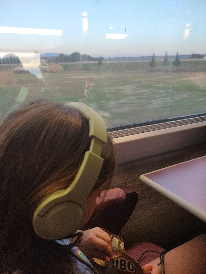 The image depicts the interior of a train carriage, viewed from slightly behind a seated passenger, looking towards the window. The person, identifiable by the back of their head and upper torso, has dark brown hair and wears light green over-ear headphones. Their right hand is visible, holding an open, yellow-packaged bag of HARIBO brand candy. They are seated in a reddish-brown upholstered train seat, with a white, rectangular table featuring a reddish surface partially visible to their right. Through the train window, a rural landscape is visible under a clear, light blue sky, suggesting either dusk or dawn. The exterior scene features expansive green fields, scattered trees including some resembling cypresses, and faint hills or mountains in the distant background. The visible motion blur in the foreground landscape indicates the train is in transit. Reflections of interior lights and structural elements are apparent on the window glass. The train is traveling through a rural area, consistent with the landscape surrounding the city of Avignon, France, likely on an approach to or departure from the Avignon TGV station.