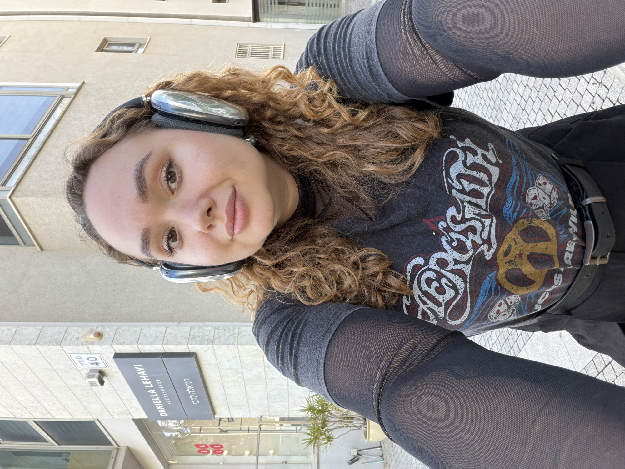 A woman with curly hair is wearing headphones and a graphic t-shirt. She is standing outside a store identified by a sign that reads "DANIELA LEHAVI ACCESSORIES" in English and Hebrew. The store is located at 40 Sderot Moriah Street, Haifa, Israel.