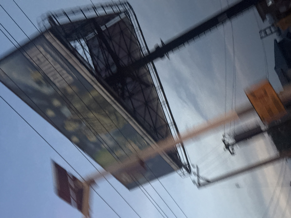 A blurred, upward-angled view features a large billboard structure against a cloudy sky