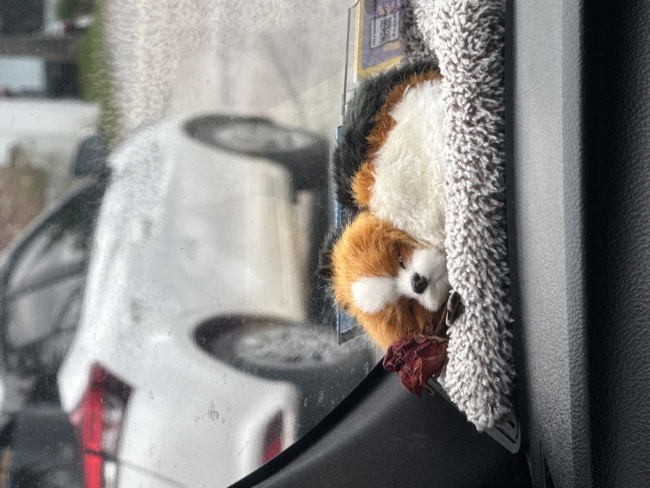 The image depicts the interior of a vehicle, viewed through a moderately soiled windshield, in Tong Yang, Thailand. The primary subject is a small, plush toy designed to resemble a sleeping tri-color puppy, featuring white, orange-brown, and black fur patterns, with a distinctive white blaze on its forehead. The toy rests on a textured, light brown or greyish-brown fabric mat, positioned on the vehicle's dashboard. Adjacent to the plush toy's left, a single dried, dark red flower is present. Behind the toy, further on the dashboard, several rectangular objects are visible, one displaying discernable Thai script. The vehicle's dark grey dashboard and a portion of an A-pillar are visible in the immediate foreground. Through the windshield, a blurry white vehicle, likely a sedan or hatchback, is visible in the mid-ground, showing its rear left quarter and part of its front right side. Beyond this vehicle, indistinct elements of an outdoor environment, including green ground cover and faint structural outlines, are discernible.