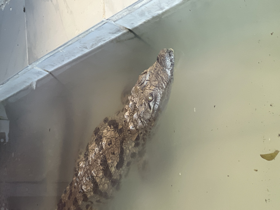 In Barza Municipality, Syria, a crocodile is partially submerged in murky, light-brown water within what appears to be a concrete or tiled enclosure