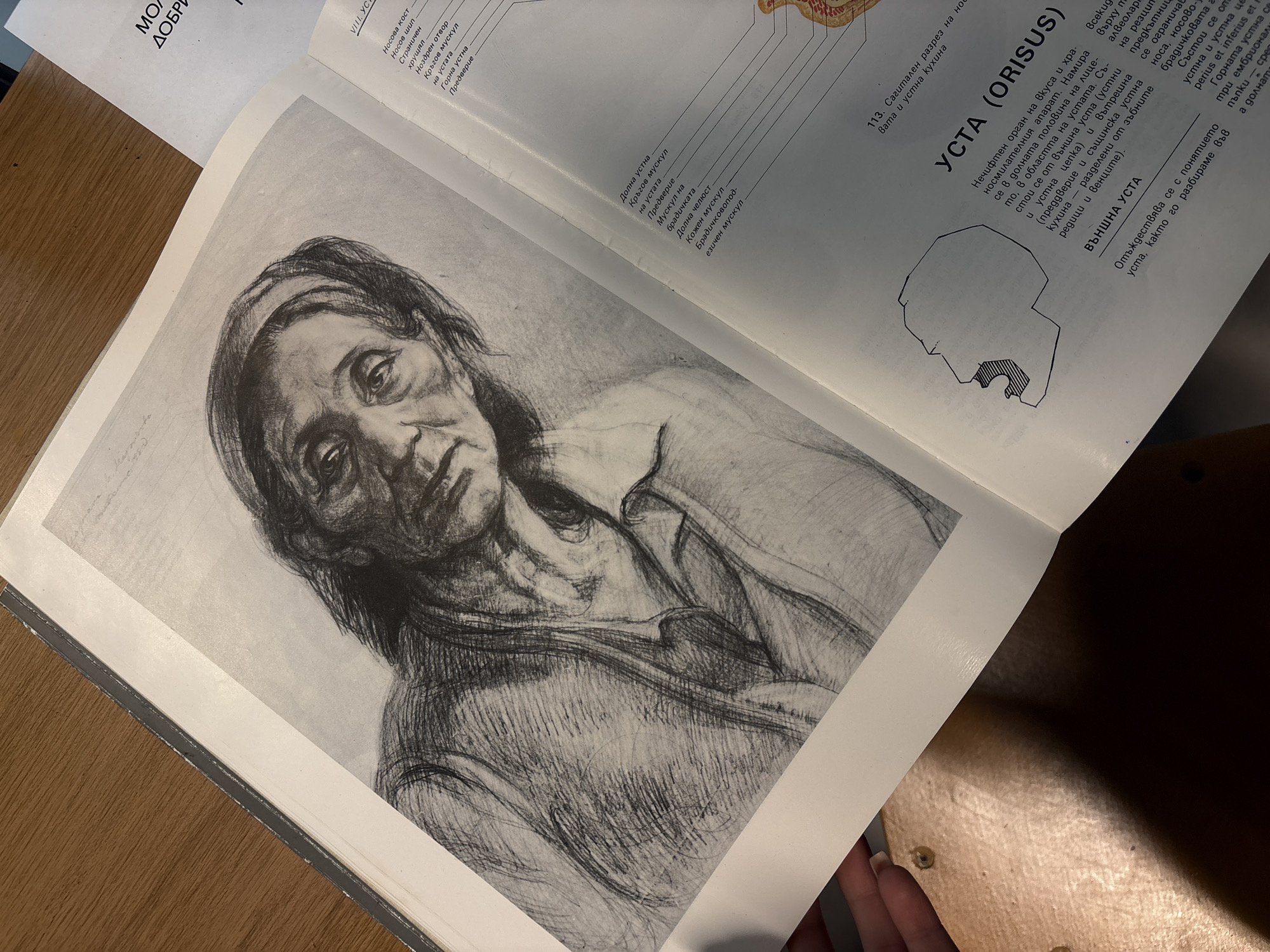 n open book, possibly a medical or anatomical text, lying on a wooden surface. The page on the left features a detailed charcoal or pencil drawing of an elderly woman's face and upper torso. She appears to be wearing a headscarf or bandanna. The opposite page contains text in Bulgarian, with diagrams and anatomical terms related to the mouth ("УСТА (ORISUS)"). The location of the scene is not discernible from the image alone; therefore, it is not possible to verify if the photo was taken in Burgas, Bulgaria.