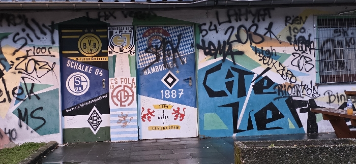- "Three doors with graffiti feature German football clubs Borussia Dortmund (BVB), Schalke 04, Hamburger SV, and Bayer Leverkusen" by FM-hFjFV2, licensed under CC BY 4.0