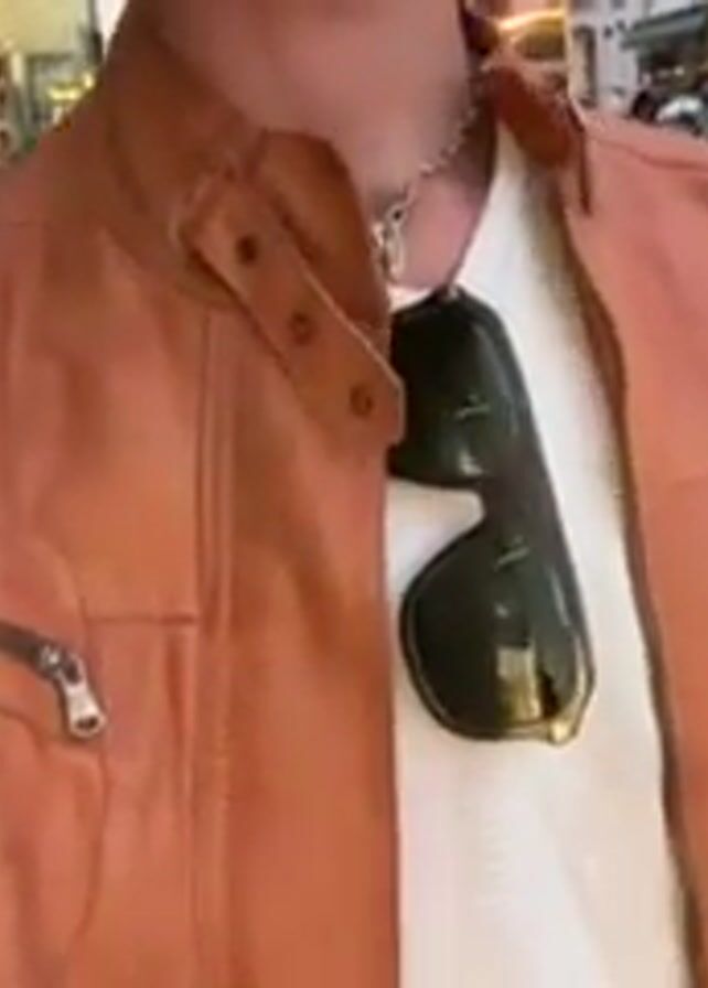 A person stands on a sidewalk, wearing a tan leather jacket over a white shirt. Sunglasses hang from the collar. A silver chain necklace is also visible. Pedestrians walk past in the background. There are storefronts and cars visible on the street. The person filming is stationary. The scene appears to be in an urban environment during the day.
