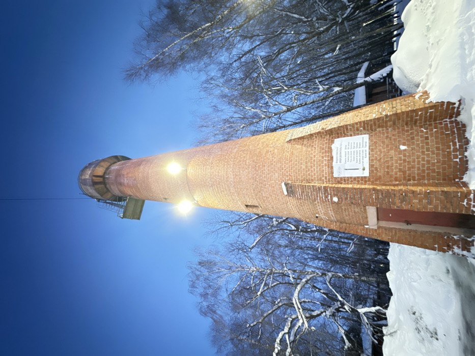 A tall brick tower rises sharply against a clear blue sky. The tower is round with a small platform at the top. Several lights shine brightly along the structure. Snow-covered trees line the base of the tower. A small, framed sign is affixed near the bottom, next to a doorway. Snow is piled high near the entrance.