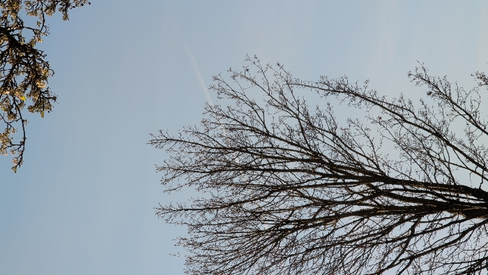 The image depicts an outdoor scene with a clear, light blue sky dominating the upper two-thirds of the frame. A large deciduous tree, mostly bare of leaves, occupies the lower left and central portions, extending its dark, intricate branches upwards. In the upper right corner, a portion of a separate tree branch is visible, displaying numerous small, light-colored blossoms or buds, suggesting early spring. A thin, white aircraft contrail diagonally traverses the sky in the upper-middle right section. No individuals, animals, or artificial structures are discernable. The scene is located in Venray, Netherlands.