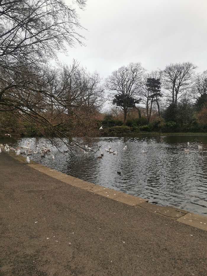 The image displays a scene from the lake in St Stephen's Green, Dublin, Ireland, under an overcast sky