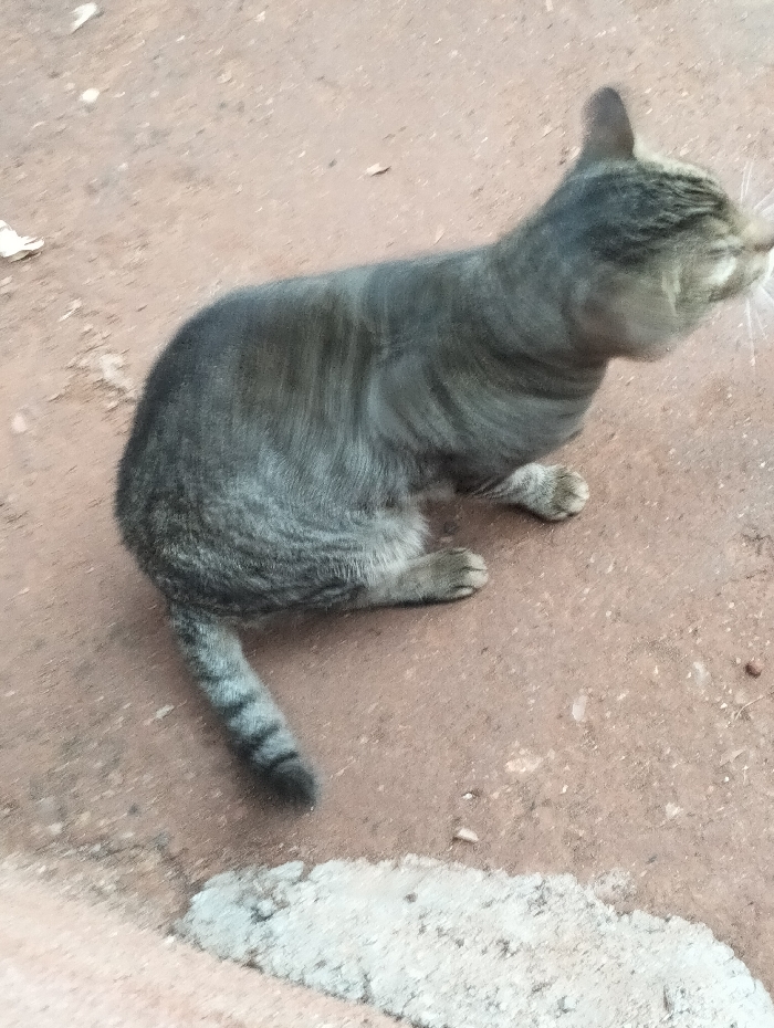 A grey tabby cat sits on a reddish-brown surface. The cat's body is curled slightly, with its tail curled to the side. The tabby's coat is a mix of grey and dark stripes. Its head is turned to the right, partially out of focus. A patch of white concrete or stone is visible in the lower portion of the picture. The background consists of the reddish-brown surface.