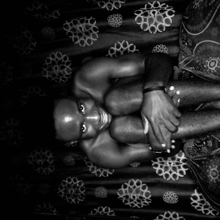 A black and white image depicts a young adult male seated indoors in Narayi, Nigeria. The subject, unclothed from the waist up, is positioned centrally, hunched forward with knees drawn towards his chest, his arms wrapped around his shins. He possesses dark skin, short hair, and is looking directly at the camera with a smile. A dark wristband is visible on his left wrist. The background consists of dark fabric with a repeating pattern of light-colored, stylized circular motifs. The individual is seated on a surface with an intricate, dark patterned design. Strong frontal illumination creates highlights on the subject's skin, contrasting with the darker environment.