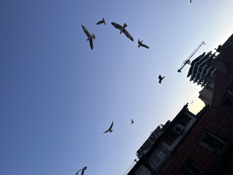 The image displays an urban landscape in Varna, Bulgaria, viewed from a low angle looking upwards towards a clear, gradient blue sky, indicative of either dawn or dusk. Approximately ten to fifteen seagulls are actively flying across the sky, their silhouettes prominent. One bird is also perched on a rooftop in the mid-left. In the lower-left and mid-left section, an older, multi-story residential building is visible, characterized by a red tiled roof, dark-framed windows, weathered white-painted walls, and an externally mounted air conditioning unit. Several dark panels, consistent with solar installations, are present on a higher section of this building's roofline. To the mid-right, a modern high-rise building is under construction, featuring a stepped or terraced architectural design. A large construction crane is positioned immediately adjacent to this unfinished structure, its boom extending upwards into the sky. Other less distinct buildings form the background between the primary structures. The scene depicts a juxtaposition of established urban architecture with ongoing development. The precise street or specific neighborhood within Varna cannot be determined from the visual information provided.