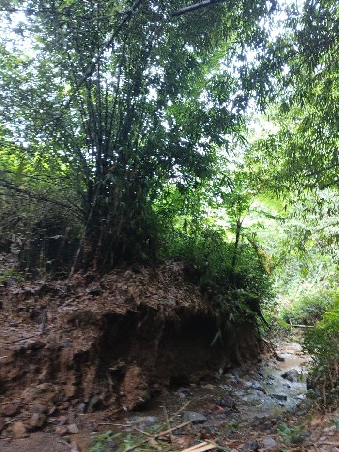The image depicts a natural environment within Situm, Papua New Guinea, specifically a narrow gully or streambed. A small, shallow stream with rocky beds flows from the background towards the foreground, centered slightly to the right. The left side of the scene features a steep, eroded bank composed of dark brown earth and scattered rocks, rising sharply. This bank is heavily vegetated, primarily by dense clusters of tall bamboo trees with dark green foliage extending upwards and overhead, creating a partial canopy. Additional smaller green plants are interspersed along the bank. The right side of the stream also shows dense green foliage, likely bamboo and other undergrowth. Light, possibly from an overcast sky, filters through the dense tree canopy, illuminating the scene. No individuals, man-made structures, or explicit actions are observed. The ground in the immediate foreground contains fallen leaves and bamboo debris.
