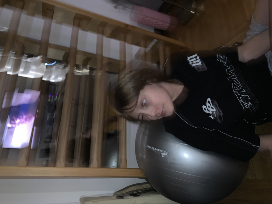 A young person rests their face on a grey exercise ball. The person wears a black, long-sleeved shirt with white graphics. A wooden stair railing is visible in the background, along with a television displaying purple hues. A pink cylindrical object sits on a shelf above the railing. The image is slightly blurred due to the camera movement.