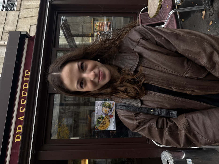 A young woman with medium-long, wavy brown hair stands outdoors, centered in the frame, in front of a brasserie on a street in Paris, France