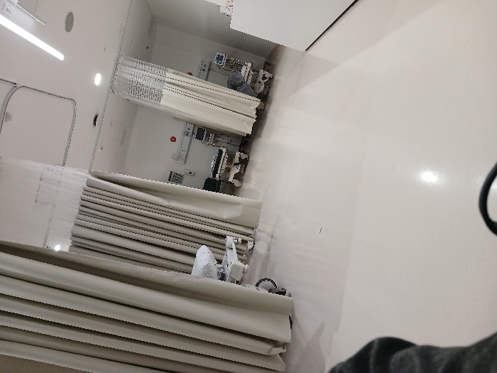 The image depicts the interior of a medical facility in Cali, Colombia. The scene is brightly illuminated, with white walls and a light-colored, reflective floor. Overhead, the white ceiling features linear fluorescent light fixtures and several recessed circular lights, along with visible tracks for privacy curtains. Multiple patient bays are delineated by light beige privacy curtains suspended from these ceiling tracks; some curtains are partially drawn, others extended. In the midground, at least three medical beds or gurneys are visible within these bays. The leftmost bed is partially obscured by curtains but shows a white patterned cover. Further into the room, two additional beds are visible, each accompanied by patient monitoring equipment with screens, IV poles, and wall-mounted medical service panels for power and gasses. The floor appears clean and uniform. No individuals are clearly visible within the patient bays, and no specific actions or interactions are depicted. In the lower left foreground, a partial view of a dark grey sleeve and a black handle are present, consistent with a person or object immediately in front of the camera's perspective.