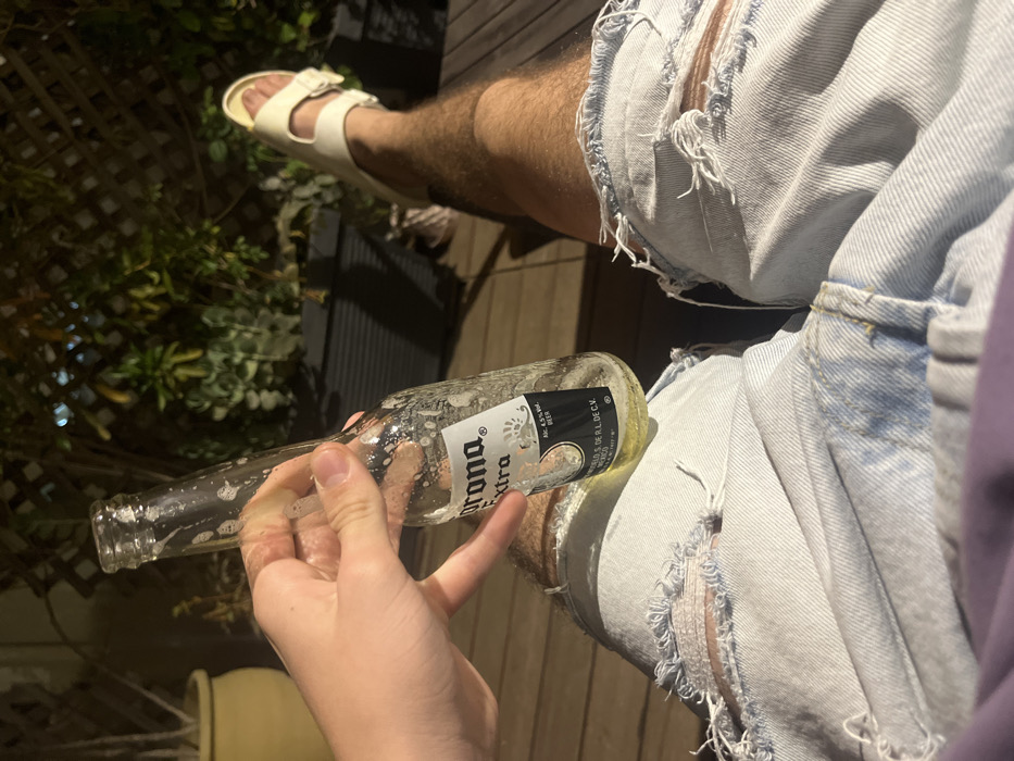 A low-angle, close-up shot depicts an individual relaxing in an outdoor setting, identified as being in the city of Tel Aviv, Israel. The subject's right hand is centrally positioned, holding an almost empty clear glass Corona Extra beer bottle, which contains a small amount of pale yellow liquid and residual foam. The person is wearing light blue, distressed denim shorts with visible rips on the thighs. Their right leg is extended, and a white, open-toed slide sandal is visible on their right foot. The immediate foreground and midground consist of dark wooden decking. In the blurred background, various green potted plants are visible, including one in a yellow ceramic pot to the left and others within dark rectangular planters. Behind the foliage, a dark lattice or trellis structure is present. The scene is illuminated by artificial light, suggesting evening or nighttime conditions.