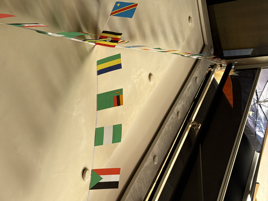An interior upward-angled view in Salé, Morocco, displays a string of national flags (bunting) suspended horizontally across a light-colored, textured ceiling. From left to right, identifiable flags include Sudan (black, white, red, with a green triangle), Nigeria (green, white, green vertical stripes), Zambia (green with an orange eagle and lower right stripes), and Gabon (green, yellow, blue horizontal stripes). A secondary string of flags descends perpendicularly from the right side of the main string, prominently featuring Uganda (black, yellow, red, with a white circle containing a crane) and the Democratic Republic of Congo (light blue with a yellow star and a red diagonal stripe bordered by yellow). The ceiling is fitted with multiple circular recessed light fixtures. Below the flags, a dark-colored retractable awning or blind system is partially visible, positioned beneath a grey horizontal beam that also contains recessed lighting. Beyond the awning, an outdoor area is partially discernible, showing a white umbrella and an orange triangular object. No individuals are present, and no actions or interactions are depicted.