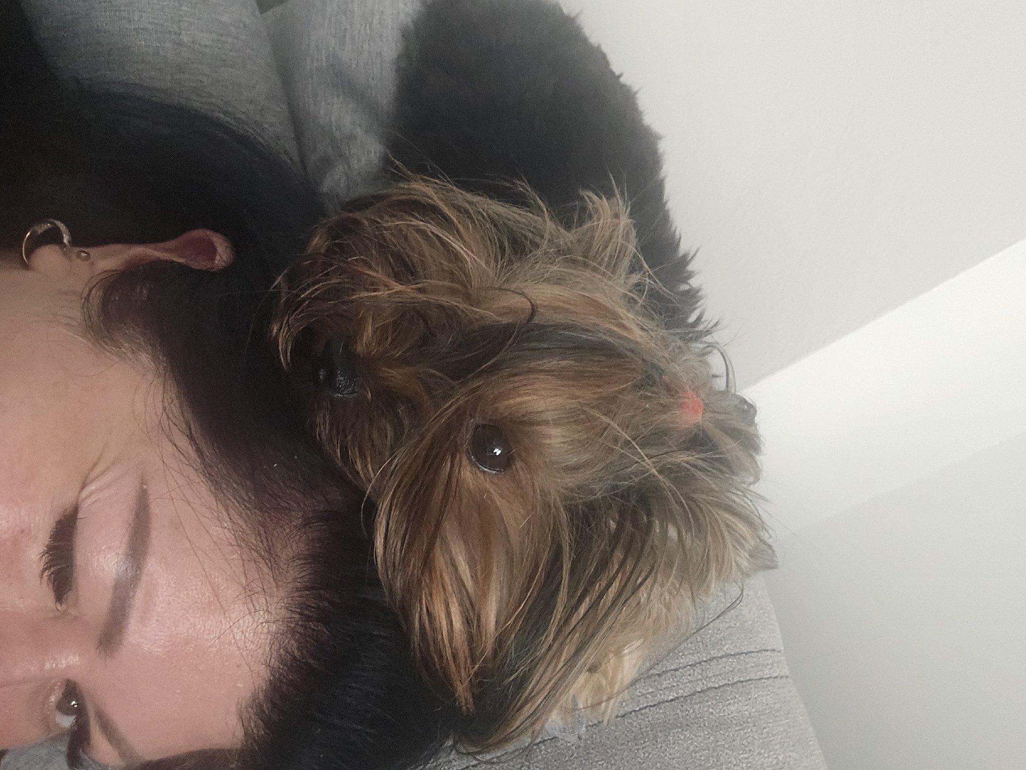 A close-up, vertical shot depicts a small, long-haired dog resting on the head of an individual. The dog, likely a Yorkshire Terrier, possesses shaggy brown and black fur, with a small red elastic band securing a topknot. Its left eye is visible, appearing dark and round, looking towards the viewer. The dog's body is largely obscured, but a dark, furry mass extends to the left, indicating the rest of its form. Below the dog, the top of a human head is visible, showing dark hair and the right side of the face. An adult's right eyebrow, eye, and the upper part of the cheek are discernible. The eye is open, looking slightly upwards and to the right. Long, dark eyelashes are prominent. A gold-colored hoop earring is visible in the lower part of the right ear. The person's hair is dark. The background consists of a plain, light-colored (white or off-white) wall in the upper left, transitioning to a light gray, textured upholstered surface (possibly a sofa or chair back) on the right and behind the dog. The lighting is soft and even, suggesting an indoor setting. The image does not contain identifiable landmarks or elements to confirm its specific location within Varna, Bulgaria, or even that it is in Varna.