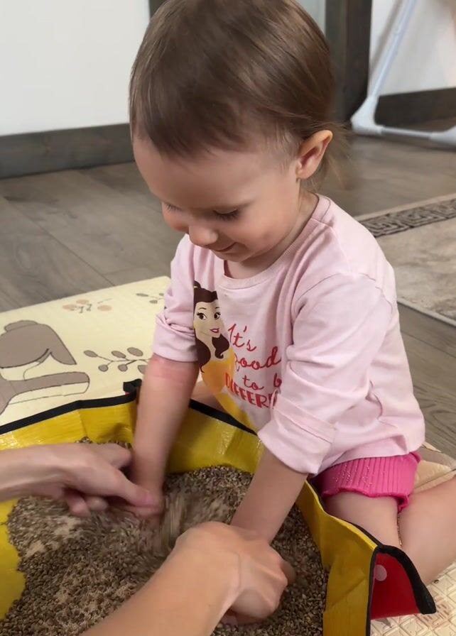 A small child sits cross-legged in a yellow and red container on a patterned mat and smiles as an adult whose hands are visible lifts and pours grains in the container. The child is wearing a long-sleeved pink shirt with a graphic and pink shorts. The container appears to be full of tan and dark brown grains, possibly lentils or seeds. The adult's hands are visible in the lower left corner of the frame, and they are manipulating the grains. The room has wood floors and a white wall in the background.