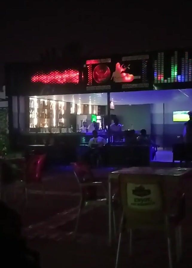 outdoor seating area of a bar or restaurant at night. Several tables and chairs are visible, along with a partially visible building with colorful lights and screens above the bar. People are inside the establishment, some sitting at the bar. The overall lighting is dim, creating a nighttime atmosphere.