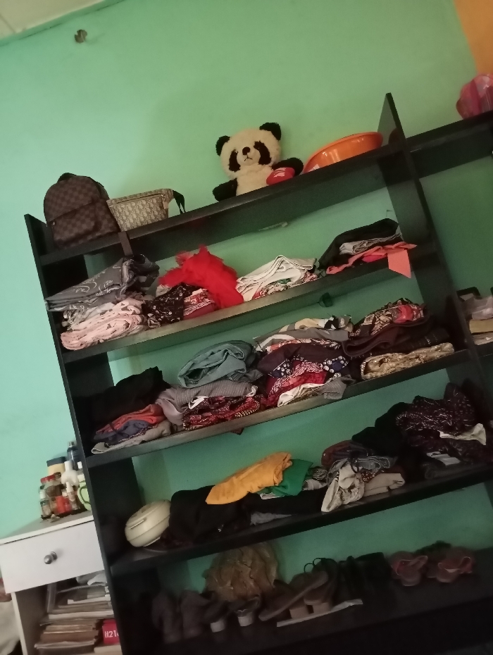 - "A black, four-shelf bookcase is packed with clothing, accessories, and objects" by FM-nR6KD3, licensed under CC BY 4.0