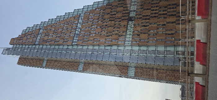 The image displays a tall, modern skyscraper, identified as The Atlas Building, located in Old Street, London, United Kingdom. The building dominates the frame, exhibiting a distinctive stepped, tapering architectural design. Its facade is a combination of vertical sections of clear glass curtain walls and extensive areas clad in textured, light-brown panels. The brown panels feature numerous small, irregularly spaced rectangular windows. The upper section of the building tapers to a point, culminating in a glass structure and a slender antenna. In the foreground, a low barrier system is visible. This system comprises a base of red and grey modular plastic blocks, possibly Jersey barriers, supporting a series of metallic crowd control barriers or construction fences. The ground beneath the barrier appears to be dark asphalt. The sky above is a clear, light blue. No individuals are present in the scene, and no discernible actions or interactions are occurring. Other structures are faintly visible in the distant background to the left of the main building, suggesting an urban environment.