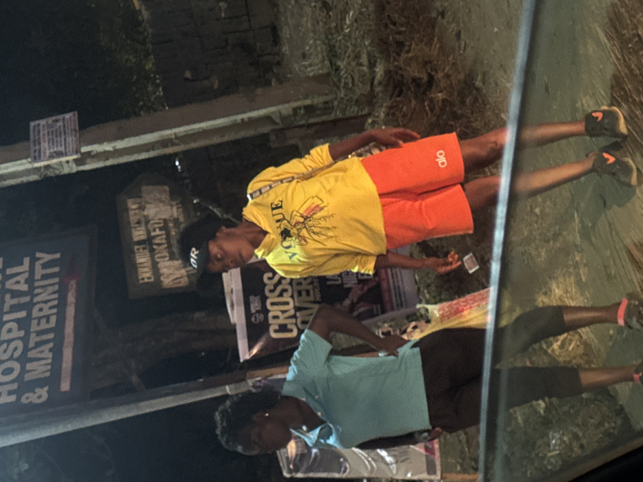 Two people are standing outside. The person at the top is wearing a yellow long-sleeve shirt with the word "Vogue" on the sleeve, orange shorts, a baseball cap, and tennis shoes. They are holding a playing card. The person at the bottom is wearing a blue shirt, grey cropped pants, and tennis shoes. Hospital signs and a cross-over sign can be seen in the background. The photo looks like it was taken through a car window.