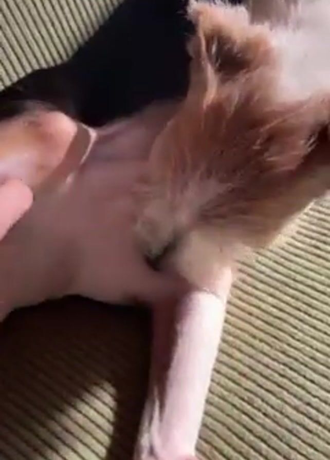 small tri-color dog, mostly white with patches of black and tan fur, lying on a green striped sofa. A hand reaches into the frame to scratch the dog's belly. The dog responds by stretching out its legs and appears to enjoy the interaction. The camera angle is from above, focusing closely on the dog and the hand. Lighting appears to be from a natural source, casting shadows on the sofa.