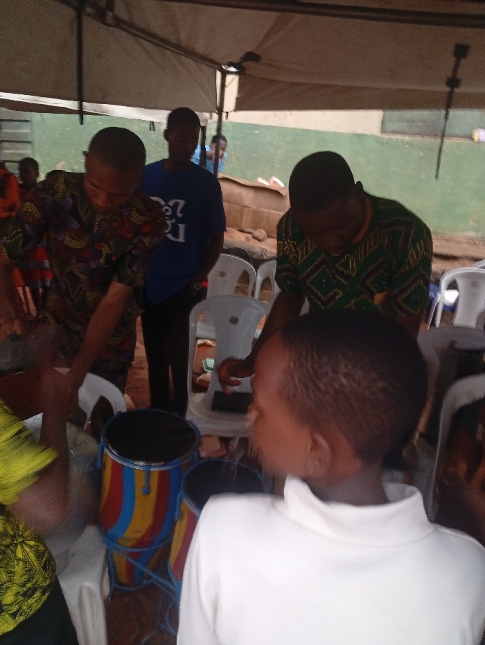The image depicts an outdoor gathering under a light-colored canopy structure in Akpaka Forest Reser, Nigeria. In the foreground, a child with short dark hair, wearing a plain white long-sleeved shirt, is viewed from behind, facing right. Two adult males are prominently featured in the midground, leaning forward. The male on the left wears a multi-colored patterned long-sleeved shirt and extends his right hand downwards. The male on the right wears a green geometric-patterned long-sleeved shirt and is also bending over, focused on an unseen object. Between these two men and to the left, two drums are present: one large and one smaller. Both drums feature vertical stripes of red, blue, and yellow, and are secured with visible blue rope. A person wearing a yellow and black patterned shirt is partially visible on the far left, with blurred hands indicating motion. Several white plastic chairs are distributed within the scene. In the background, a male in a blue t-shirt stands upright, and another individual is partially visible further back. The environment includes a building with a light green wall in the background and an unpaved, reddish-brown ground surface.