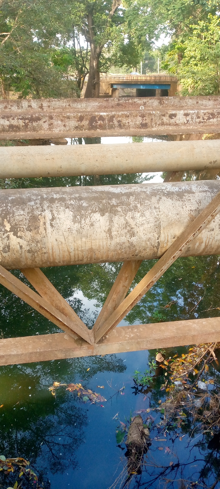 Rusty pipes dominate the foreground, supported by metal beams that intersect above murky water. The water reflects the trees overhead, mixed with fallen leaves and debris. In the background, a structure, possibly a bridge or building, is partially visible through the gaps between the pipes and trees. The overall scene has an industrial and somewhat neglected feel.