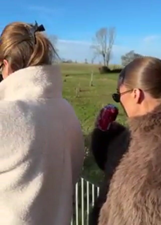 Two women stand on a balcony overlooking a grassy field and a thatched-roof house. The woman closer to the camera wears a tan, furry jacket, black sunglasses, and has her hair in a bun. She holds a red can and glances toward the house. The other woman wears a cream-colored, fuzzy coat and has her hair in a low ponytail with a black clip. The women are speaking, and the second woman puts on her sunglasses. The camera pans to the left to show the field and the house in the distance. The sky is bright blue with a few clouds. There are cars parked near the house.