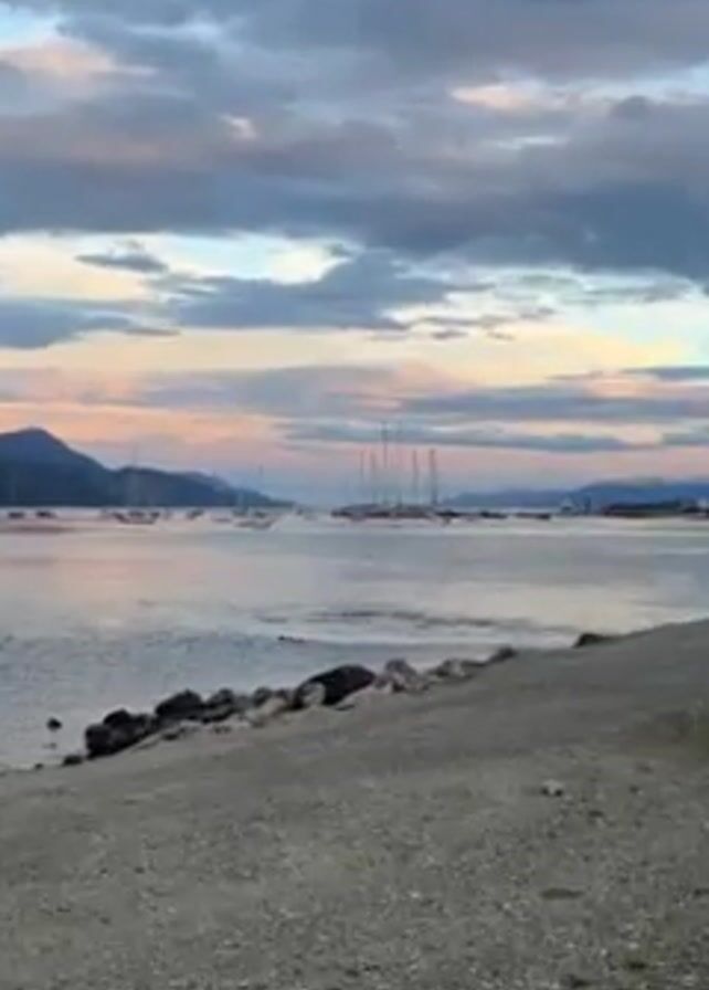 The video captures a serene coastal scene under a cloudy sky with pastel hues of pink and blue. The foreground features a gravelly beach, leading to calm waters dotted with numerous sailboats, their masts reaching skyward. Distant mountains are visible on the horizon, adding depth to the landscape. The gentle lapping of waves along the shoreline provides a tranquil ambiance to the setting.
