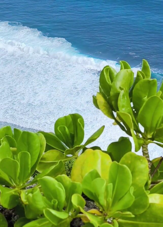 From an elevated position, the camera focuses on a vibrant green bush against a backdrop of the ocean