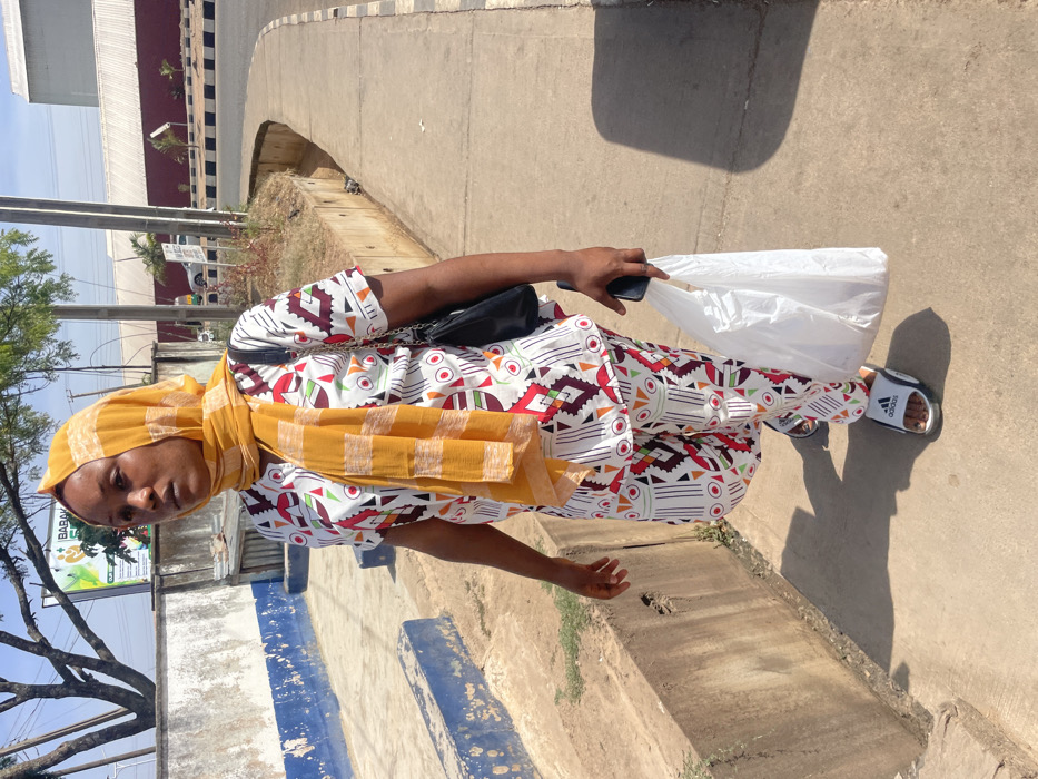An adult female is depicted walking forward on a concrete sidewalk under bright daylight in Jos, Nigeria