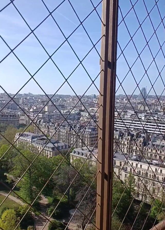 view of Paris through a wire fence, likely from the Eiffel Tower
