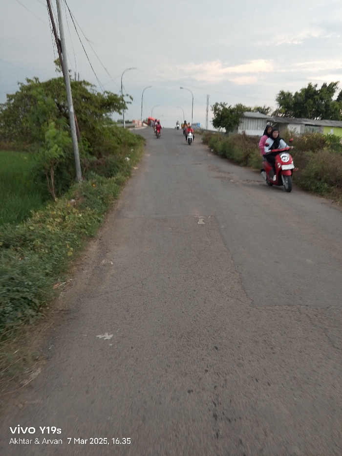 paved road with several motorbikes driving on it. The road is straight and slopes gently upwards. There are a few trees and shrubs on both sides of the road. A small group of people can be seen on a motorbike in the distance. The sky is cloudy and overcast. The image appears to be taken from a moving vehicle looking toward the front. There are multiple power lines running along the road, suggesting it is an urban area. The coordinates provided (-6.375, 108.055) place the location in Kecamatan Gabuswetan, Indonesia.