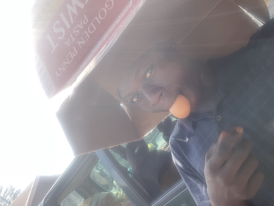 An individual, identified as likely a dark-skinned adult male, is depicted outdoors in Iranla, Nigeria. The subject wears a dark blue collared shirt with a subtle grid pattern and a brown knit beanie. A large, open brown cardboard box, bearing the red text "GOLDEN PENNY PASTA TWIST," is positioned over the individual's head. An uncracked, light brown egg is held horizontally between the subject's lips. The individual gazes directly at the camera with a subtle smirk, their right hand visible near the chest with two fingers extended. The background on the left reveals the dark frame and partially open window of a vehicle, containing indistinct items. Intense backlighting from overhead sunlight creates strong glare and shadows the subject.