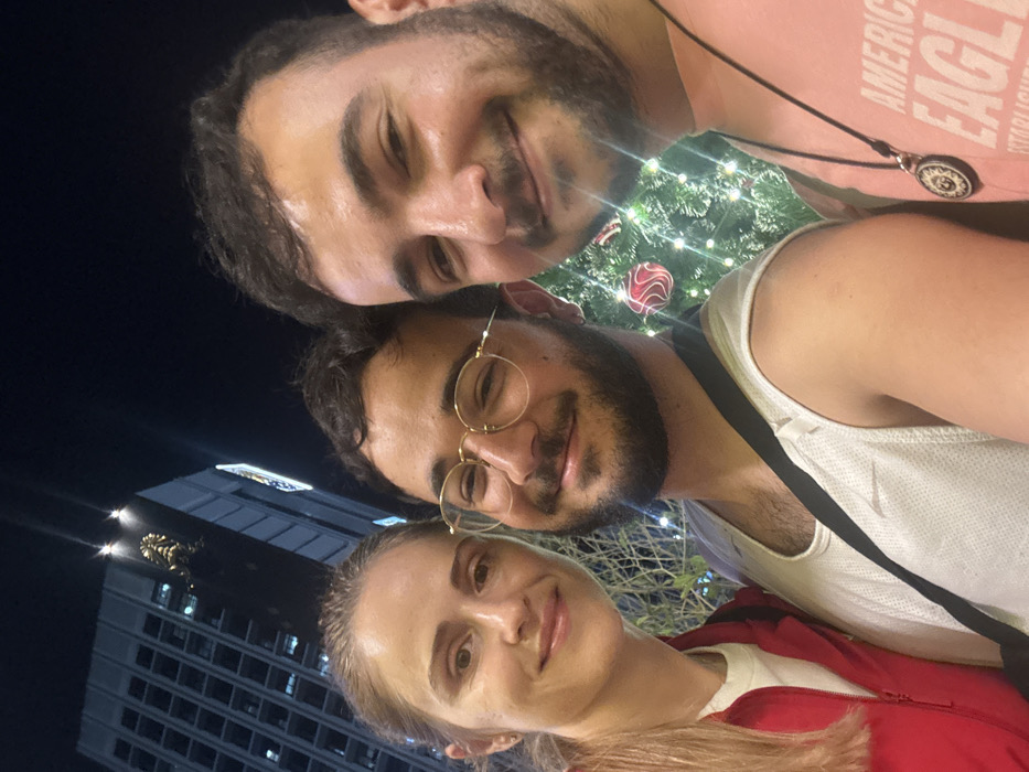 A night-time, close-up photograph depicts three individuals—one female and two males—standing in close proximity and looking towards the camera. All three subjects are smiling. The female on the left has light brown hair, fair skin, and wears a red zippered jacket over a white top. The central male, positioned slightly behind the female, has dark hair, a full beard, and wears round gold-rimmed glasses and a white sleeveless shirt. The male on the right, partially visible, has dark hair, stubble, and wears a light pink t-shirt with "AMERICAN EAGLE" text visible on the chest, along with a dark cord necklace featuring a circular pendant. The background shows artificial illumination. To the immediate right of the subjects, a portion of a decorated Christmas tree with white lights and large red and white striped spherical ornaments is visible. In the upper left background, a tall, multi-story building with numerous windows is illuminated against a dark sky. A large, illuminated golden lion emblem is prominently displayed on the facade of this building. This emblem identifies the location as being in the vicinity of the Mandarin Oriental, Bangkok, situated in the Bang Rak district of Bangkok, Thailand.