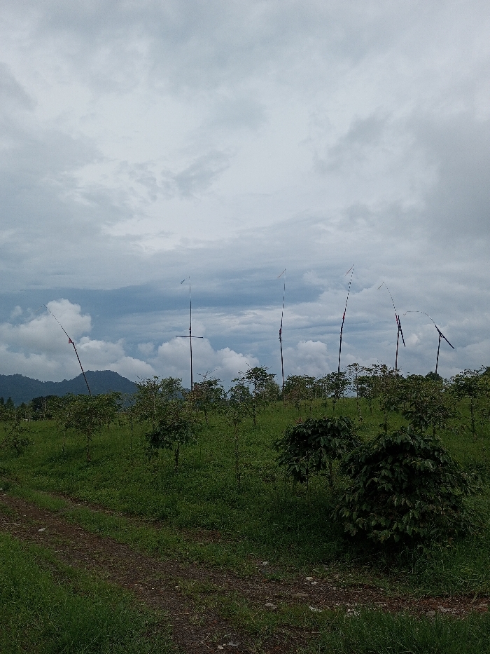 This image captures an agricultural field in Abbireddygudem, India, under an overcast sky. The foreground shows a narrow, unpaved dirt path with two distinct tracks, flanked by green grass. Extending into the mid-ground, numerous small, leafy, cultivated bushes are uniformly spaced across the green field, characteristic of a plantation. Approximately seven tall, slender poles, appearing to be bamboo, are vertically embedded in the ground among these bushes. Most poles exhibit a slight curve or bend towards their top, and several feature small, dark fabric elements attached near their apex. One central pole has a horizontal crossbar, forming a 'T' shape. In the background, distant, forested mountains are visible on the left horizon, beneath a sky predominantly covered by grey and white clouds. No individuals or animals are present, and no active interactions are depicted.