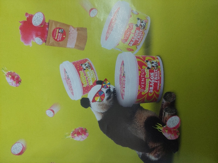 This image is a brightly colored graphic advertisement or artistic composition against a uniform lime green background. No real-world location is depicted, therefore no specific location in Athens, Greece, can be identified. A black and white panda bear, wearing multi-colored segmented round sunglasses, is positioned in the lower-left quadrant. Its head is turned to its right, appearing to interact with a white plastic product container. Several pieces of dragon fruit, both whole and cross-sectioned, are scattered and appear to be falling or floating across the green background. One whole dragon fruit and one half-cut dragon fruit are visible on what appear to be two small logs or pieces of wood near the panda's lower body. Four distinct product containers are present. Three are white plastic tubs with red and yellow labels featuring "VENTUS Groovy Bath DRAGON FRUIT" and a panda wearing sunglasses. One tub in the foreground is explicitly labeled "SHOWER BUTTER." Another tub is positioned behind and slightly above the first, and a third is tilted in the mid-right background, labeled "DRAGON FRUIT YOGURT." A brown paper-like pouch in the upper-right also features a similar label and appears to have pink, red, and white material, along with dragon fruit pieces, spilling from it.